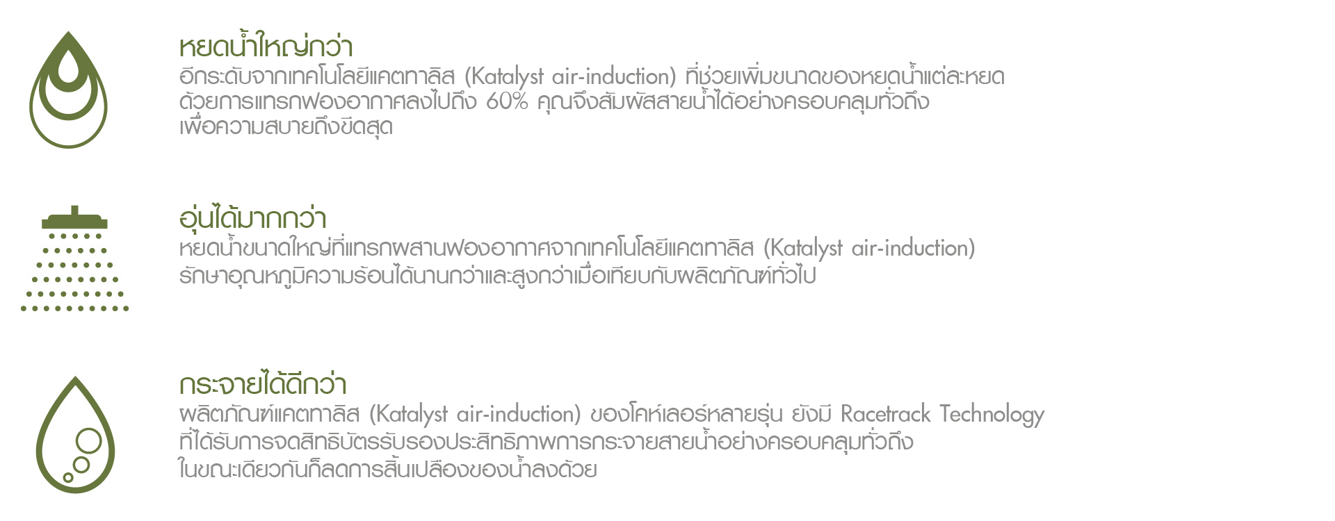 พร้อมแคตทาลิสและ Racetrack technologies ประกอบด้วยหัวสเปรย์ 3 แบบ แบบครอบคลุม แบบนวดตัว และแบบนวดตัวเฉพาะจุด เพื่อประสบการณ์การอาบน้ำที่สนุกและแตกต่างไม่เหมือนใคร ด้วยดีไซน์แบบเรขาคณิต ทันสมัย ใช้งานง่าย