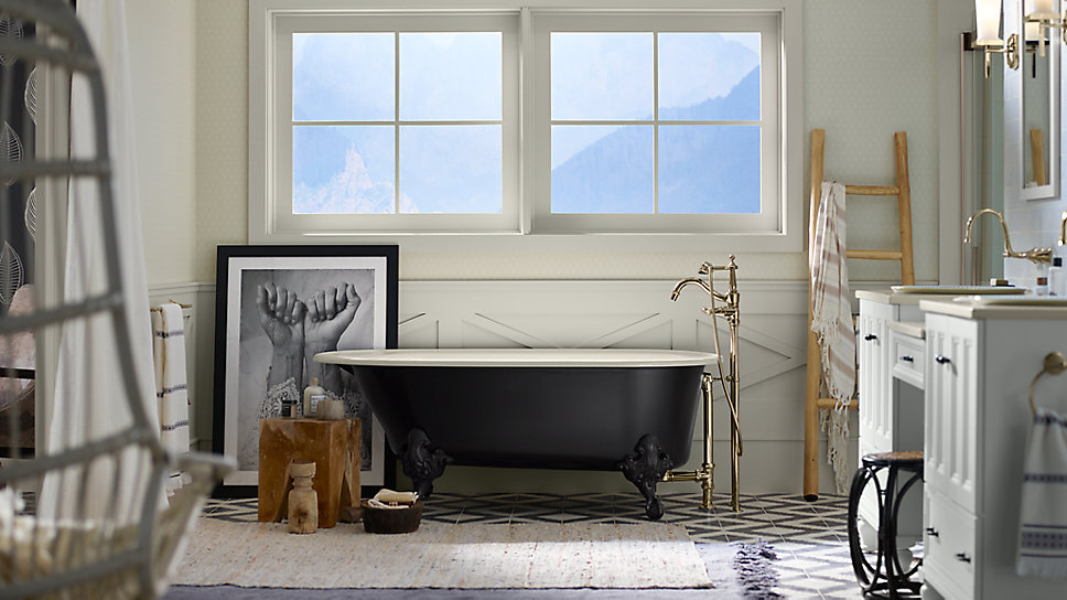 This freestanding cast iron bath features ornate ball-and-claw feet for an antique-inspired look, enhanced by the modern comforts of built-in back support and a slip-resistant floor. The classic curves of the Iron Works bath make it the perfect addition to traditional or Victorian-style bathing areas. The rich, smooth enameled interior is complemented by an Iron Black painted finish on the exterior.