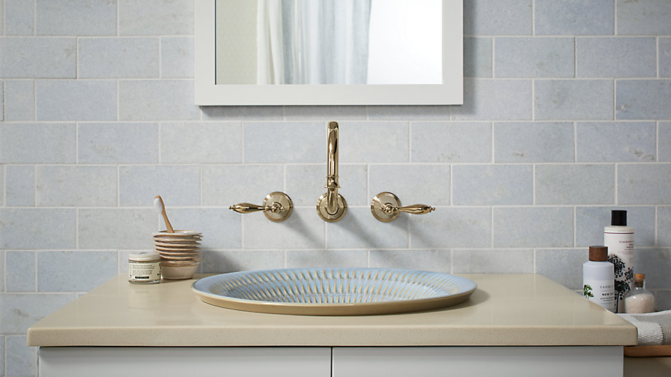 Wall-mounted Finial® faucets in Vibrant® French Gold complement the warm tones of the Derring™ lavatory’s Bluestone Rutile glaze.