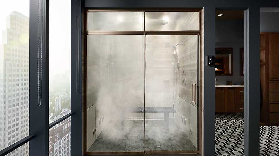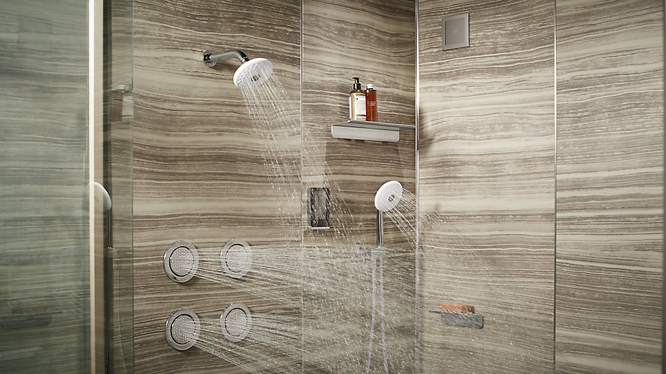 Outfitted with a large two-person shower, the space encourages shared time. Twin DTV+™ shower configurations invite both of you to enjoy personalized spa settings together or alone, including steam and music.