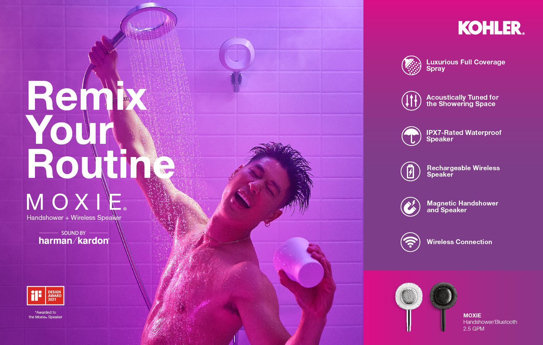 โคห์เลอร์ บริษัทชั้นนำระดับโลกด้านการออกแบบและผลิตชุดครัวและห้องน้ำ เปิดตัวผลิตภัณฑ์ใหม่ Moxie ฝักบัวอาบน้ำพร้อมลำโพงไร้สาย ให้ผู้ใช้งานได้มีโอกาสสัมผัสประสบการณ์ความเป็นเลิศด้านการออกแบบ ความทันสมัยด้านไลฟ์สไตล์ และความเหนือชั้นของนวัตกรรมเสียงจาก Harman Kardon บริษัทผู้ผลิตลำโพงระดับโลก